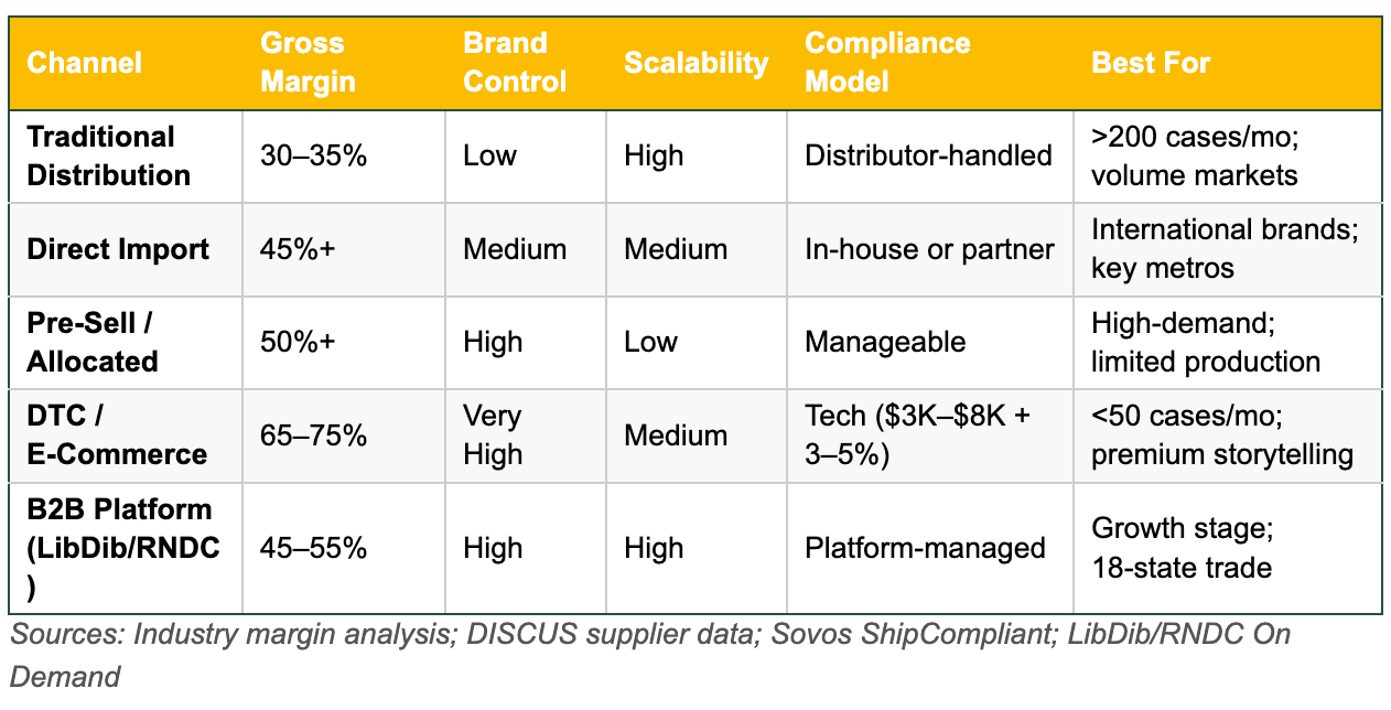Audite la economía de la distribución. Calcule la relación entre el valor y el costo de cada relación con el distribuidor. Implemente la tecnología de cumplimiento en al menos un canal directo. Si reúne los requisitos para la AB 1246 de California (solicitud de 125 dólares, permiso anual de 25 a 30 dólares), preséntela ahora. Lo mismo ocurre con el envío recíproco a Nueva York. Regístrese en LibDib para acceder al comercio en 18 estados.