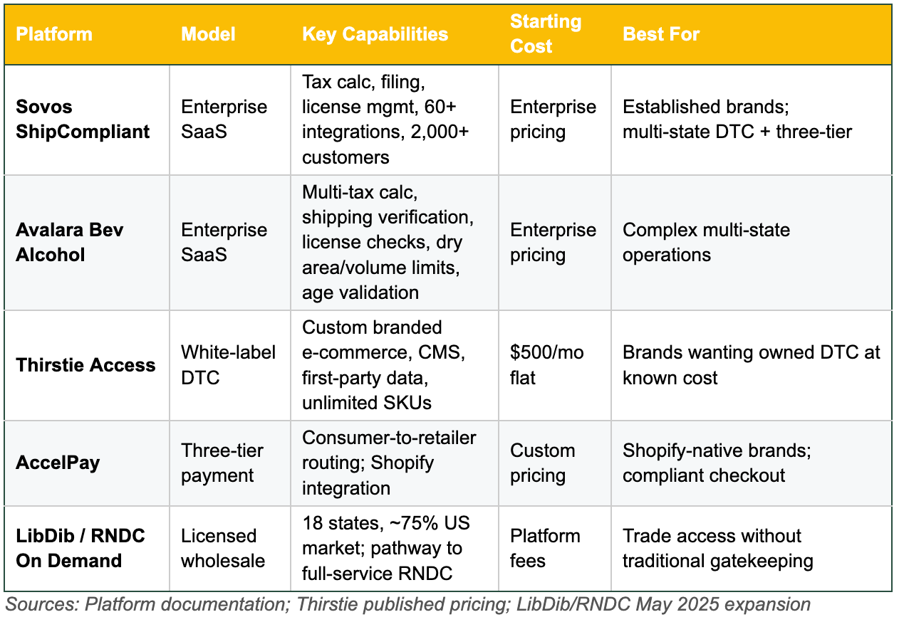 Totalmente automatizado en la actualidad: cálculo de impuestos multiestatales, verificación de edad, confirmación de entrega, límites de volumen, controles de áreas secas y monitoreo de licencias. Aún se requiere experiencia humana: navegación legal de franquicias (18 estados), aprobaciones de etiquetas estatales, listados estatales de control y casos extremos de impuestos especiales. Una novedad a tener en cuenta: las identificaciones digitales. Georgia confirmó las licencias de conducir móviles para la compra de bebidas alcohólicas en noviembre de 2025. A medida que se sumen más estados, la dificultad para verificar la edad en el DTC disminuye considerablemente.